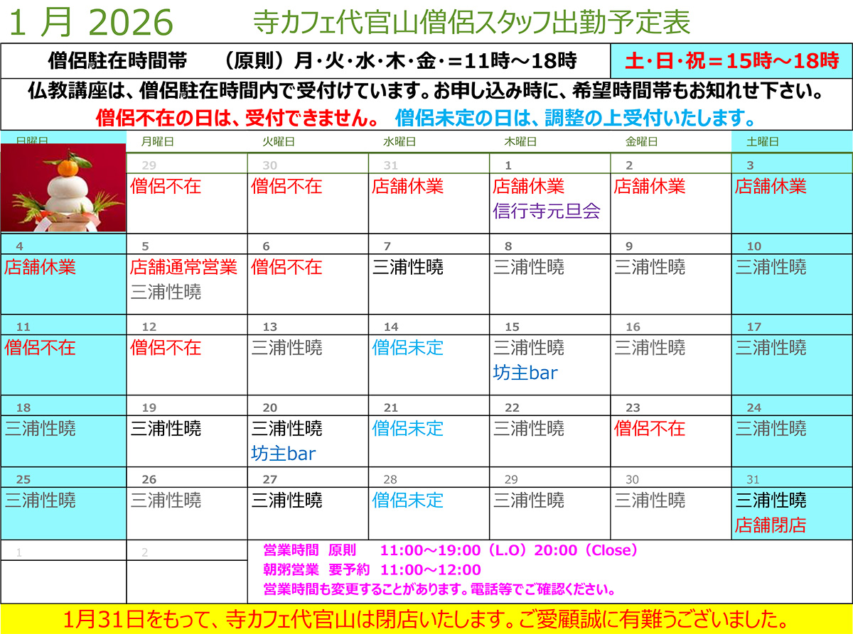 2026年1月・僧侶の駐在時間のご案内